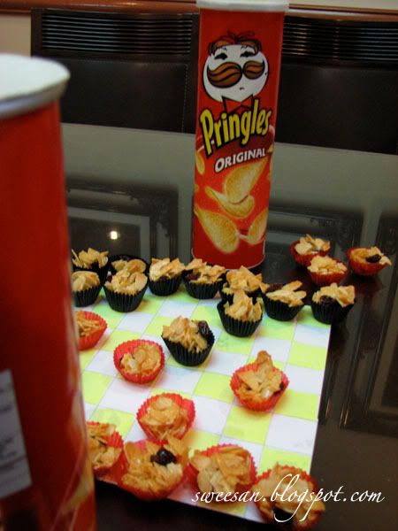 Step 6: Scoop them into small paper cups. Ah, red paper cups!! This may take a while as it gets a tad sticky after a while.. Then, put them to bake in the oven at 175 C for 7-8 minutes or till golden brown!! YES the Pringles are actually being baked!!