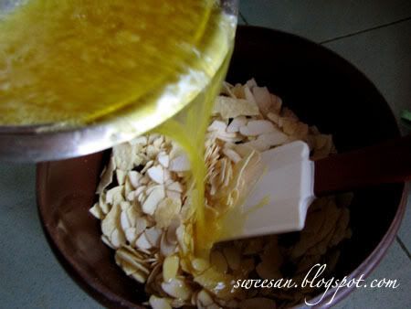 Step 5: Pour into the pringles, almond and raisins mixture. Stir well to make sure all the ingredients are coated with the melted honey butter mixture.. This will help all ingredients to stick together after baking.